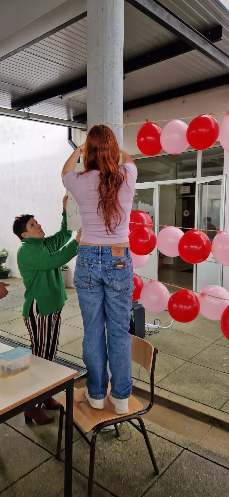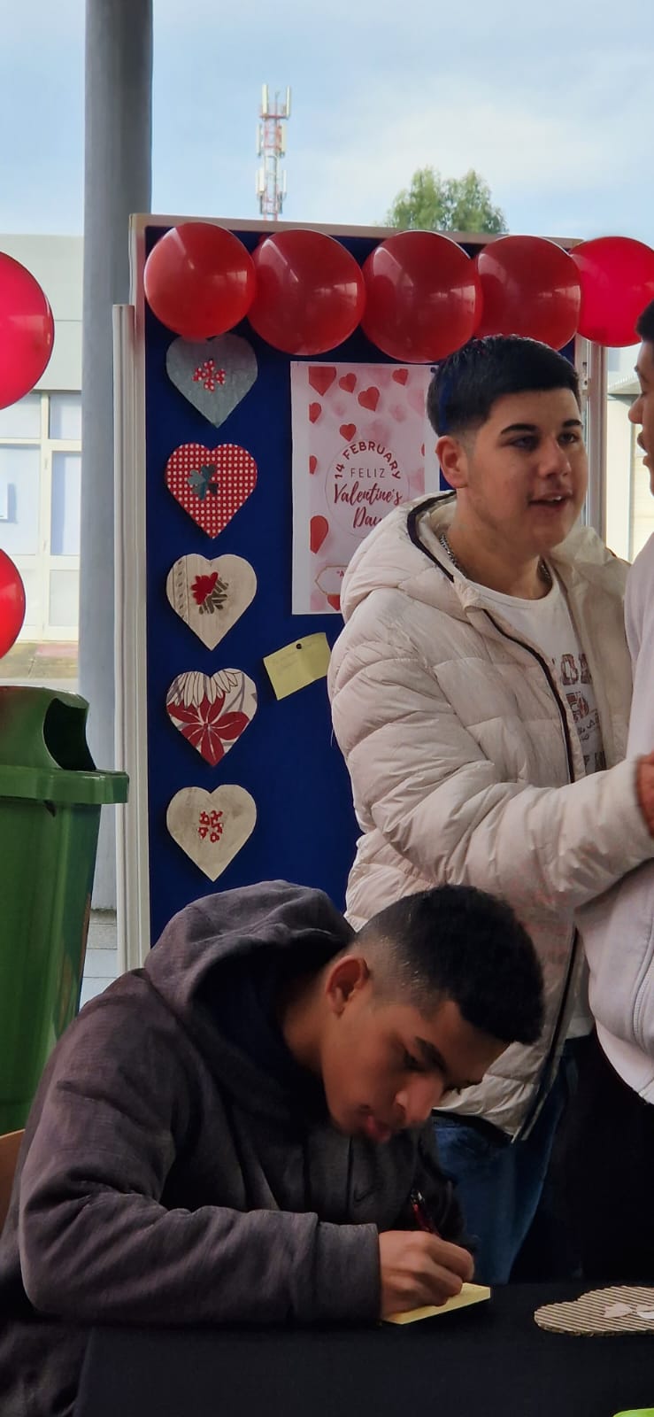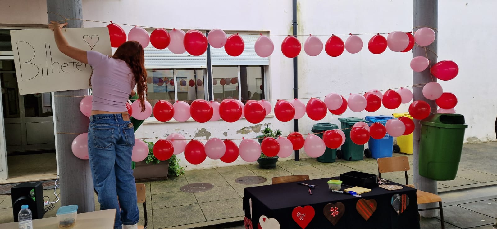 A turma do 10º C, no exterior, montou um espaço para apresentação do concurso "A mais bela cantada de amor" que tem como prémio um almoço, para duas pessoas, servido pelo Restaurante Pedagógico da ESAOF.