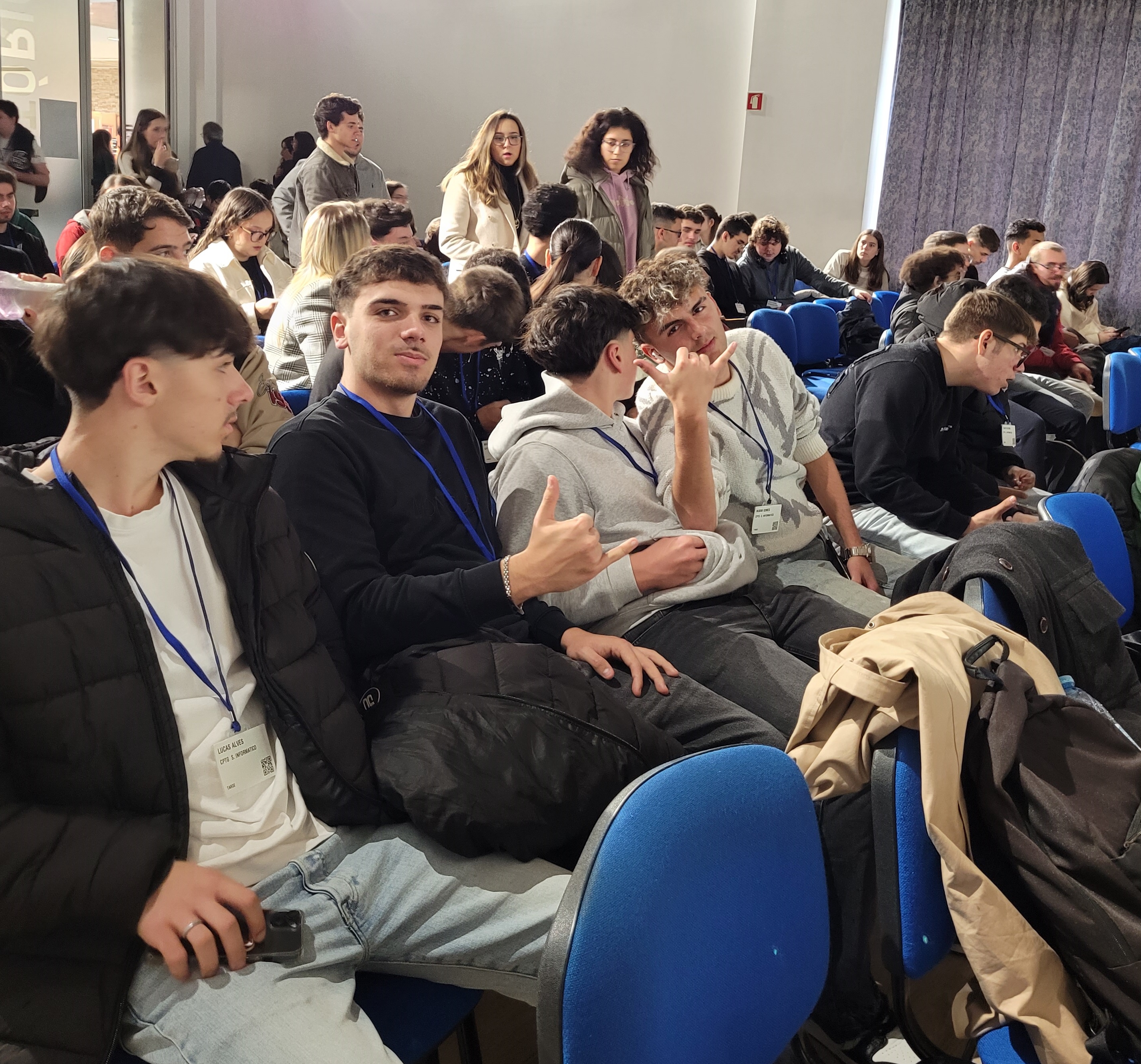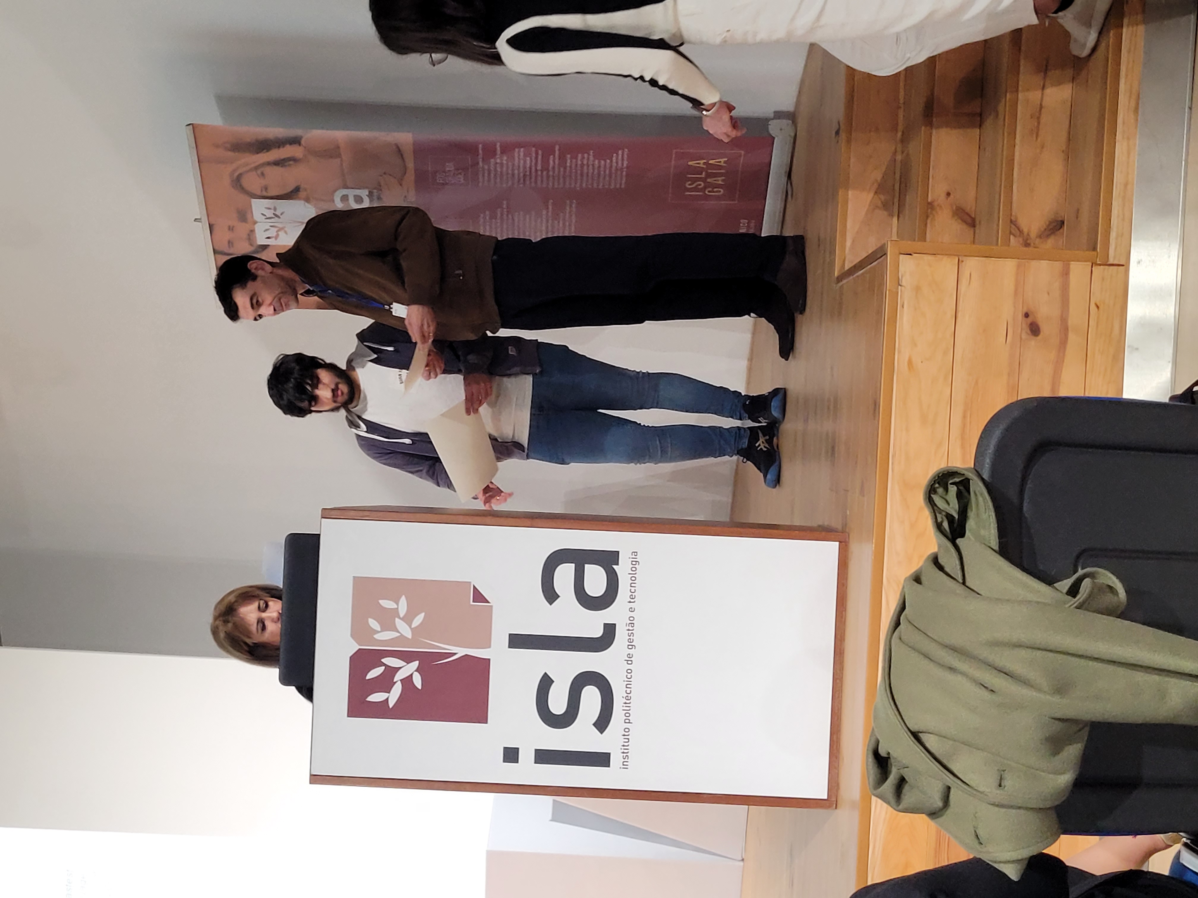 Os participantes assistiram à apresentação dos Posters Científicos premiados, celebrando especialmente o 3º lugar conquistado por dois ex-alunos da ESAOF, Alexandre e Noemi, do Curso Profissional de Técnico de Gestão e Programação de Sistemas Informáticos.