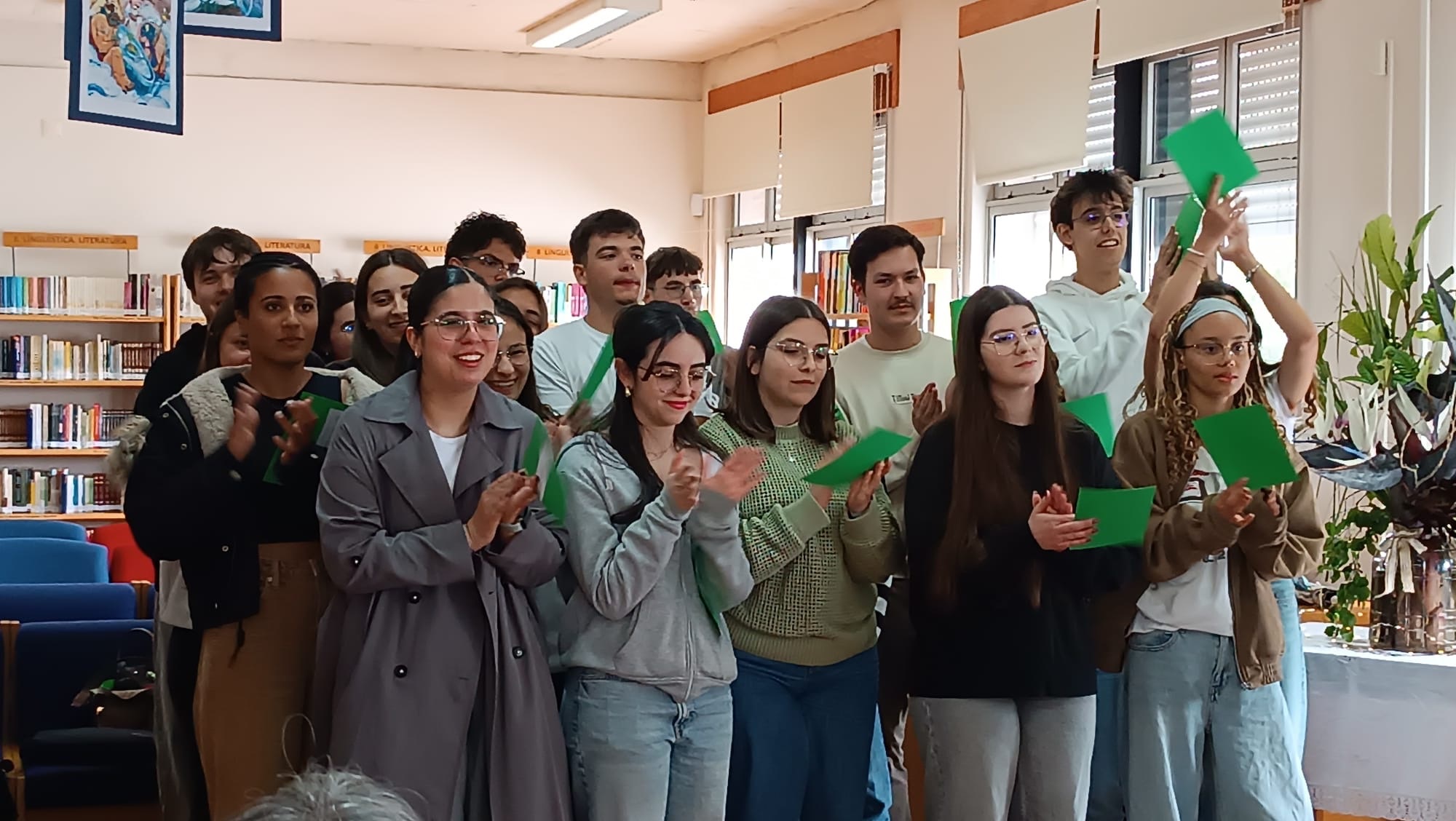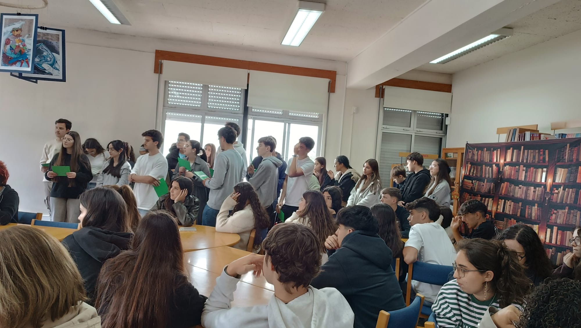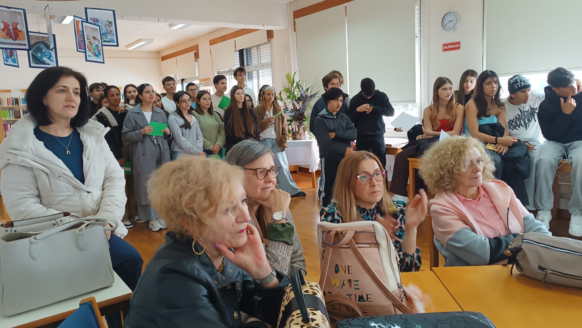 No âmbito do estudo do texto poético, os alunos do 12.º ano, da professora Lourdes Soares, turmas A e B, apresentaram na Biblioteca a atividade “Em português, dizemos “, mas “Em poesia, diz-se”. Uma partilha riquíssima de ideias que dizemos em linguagem corrente e a sua “tradução” para linguagem poética. Assistiram os colegas do 11.º A e B e vários professores.