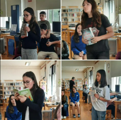 Apresentações de livros do segundo semestre, pelos alunos da sala vermelha, aos colegas das restantes salas coloridas, na biblioteca da ESAOF.