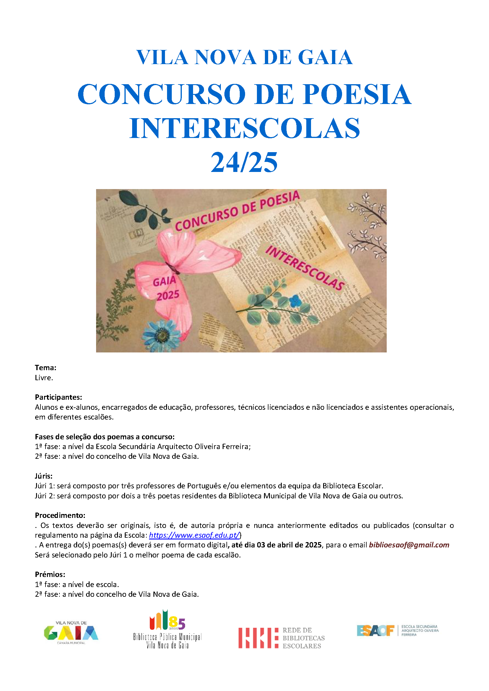 Todas as informações necessárias constam no Cartaz e no Regulamento alusivos ao Concurso. Haverá prémios para os melhores trabalhos poéticos, quer a nível de Escola, quer a nível de Concelho.