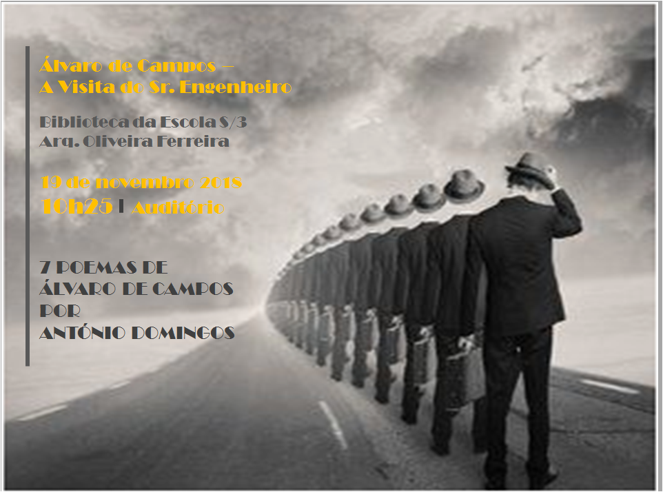 Os alunos 12.º ano da Escola S/3 Arquitecto Oliveira Ferreira irão assistir a uma performance sobre "Álvaro de Campos - A Visita do Sr. Eng. ". No dia 19 de novembro, no auditório da escola. |